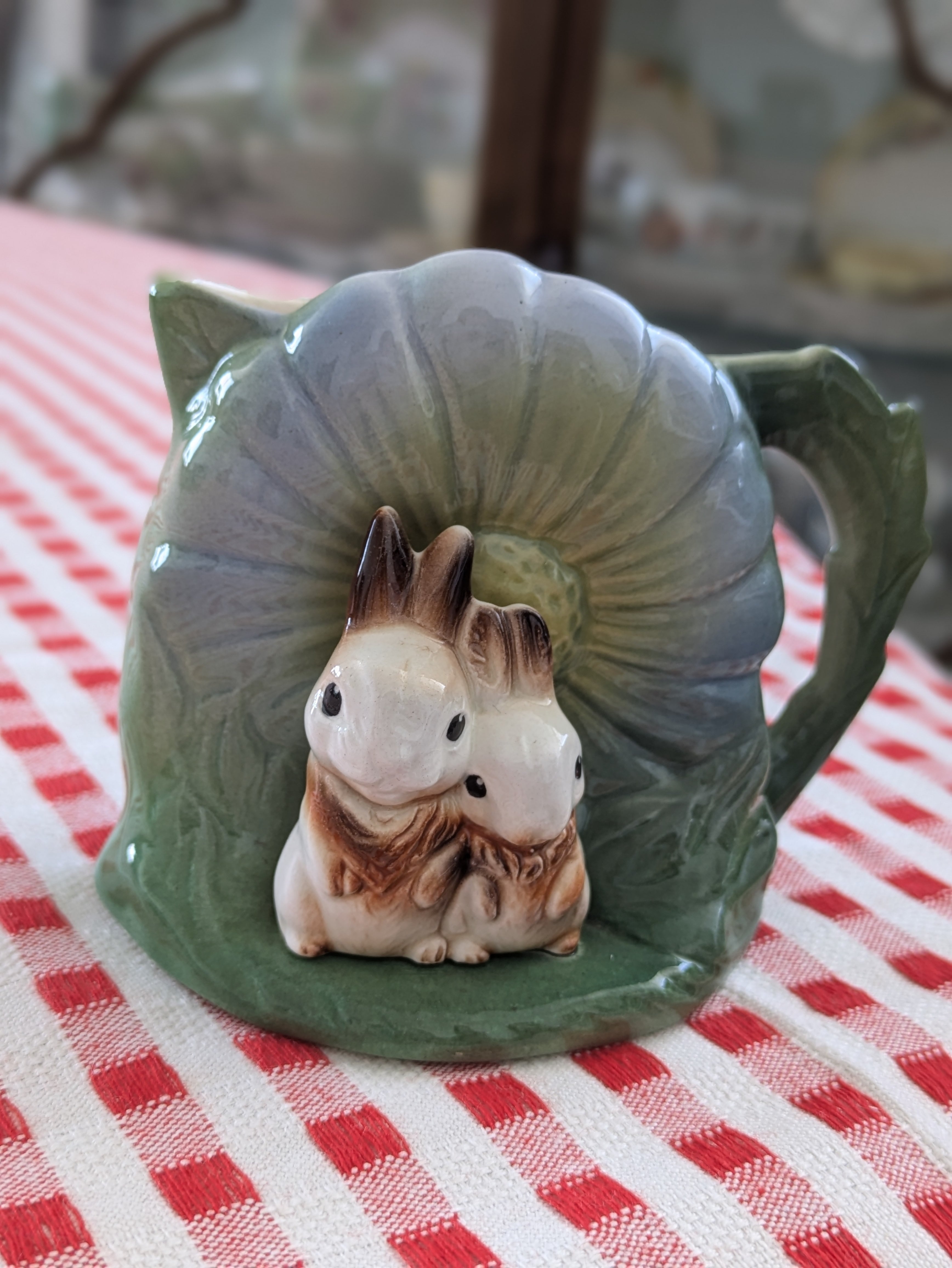 希少価値の高いビンテージアイテムとしてコレクター心をくすぐります。お茶の時間や食卓を華やかに演出するこのピッチャーは、あなたの日常を特別なものにしてくれること間違いなしです。2匹のうさぎと青い花が描かれたこの素敵な作品をお楽しみいただきながら、心温まるひとときを過ごしてみませんか?